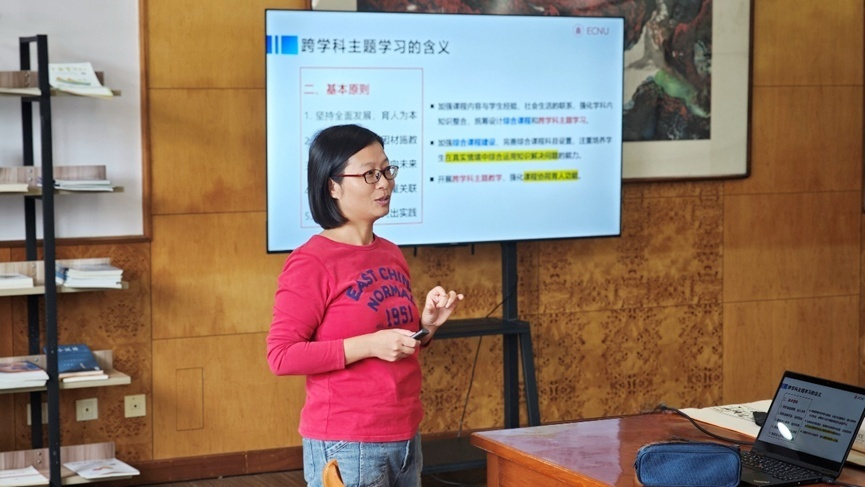 活动伊始,王美老师介绍了此次研修活动的主题《学习科学视角下的跨学科学习》。王美老师在学习科学研究方面深耕多年,对跨学科学习有独到的见解,更积累了丰富的实践经验。她首先展示了新课标文件中不同学科对跨学科学习的不同要求,这些要求都指向“加强课程综合,注重关联”的课程基本原则。王美老师阐发了跨学科主题学习的定义与意义,指出跨学科学习的重点在于培养学生在真实情境中综合运用知识解决问题的能力。她带领项目组成员分析西方跨学科学习模式,比较东西方学习科学组织模式的差异,列举优秀的跨学科实践方案,向项目组成员展示了诸如“大观念”的跨学科学习设计的新思路。讲座中,王美老师同项目组成员老师互动交流,演示具体学科跨学科实践的维度,在商讨中加深教师对跨学科不同实现路径的理解。