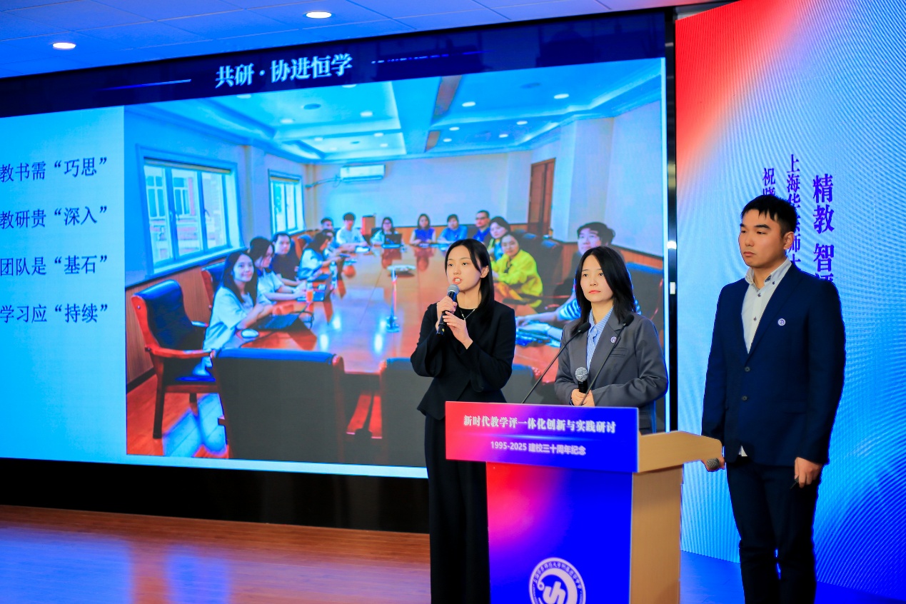 在实践分享环节,来自华东师大二附中普陀校区、华东师大四附中、华东师大附属外国语实验学校、华东师范大学附属小学、上海市铜川学校及我校的教师代表依次发言,展示了各校在教学评一体化领域的创新举措与典型经验,分享内容涵盖课程体系重构、课堂模式创新、作业系统优化、技术融合应用等方面,案例生动、路径清晰,体现了集团校在改革探索中的扎实步伐与丰硕成果。其中,我校英语教研组以“单元整体教学中的教学评一致实施路径”为主题,系统介绍了基于深度语篇研读、全程化评价嵌入的课堂实践,展现了学校在推动核心素养落地方面的积极探索。