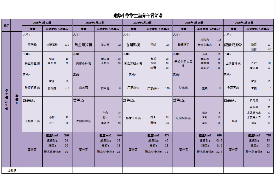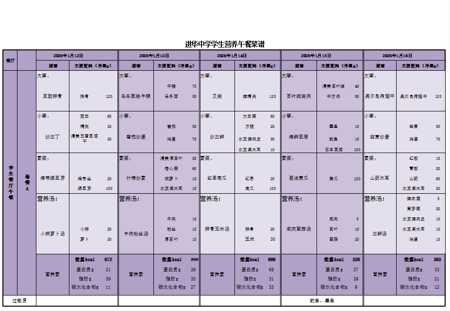 2026年1月12日—16日学生菜单