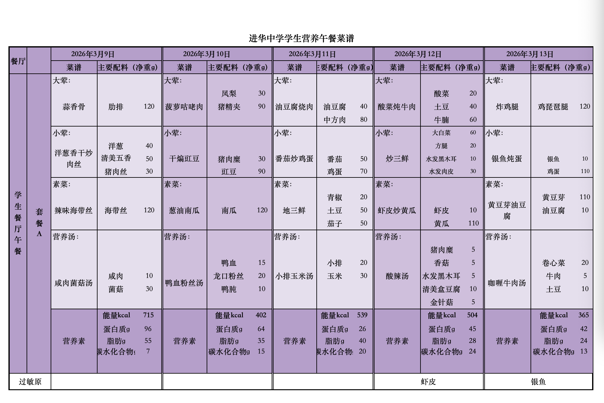 2026年3月9日—13日学生菜单