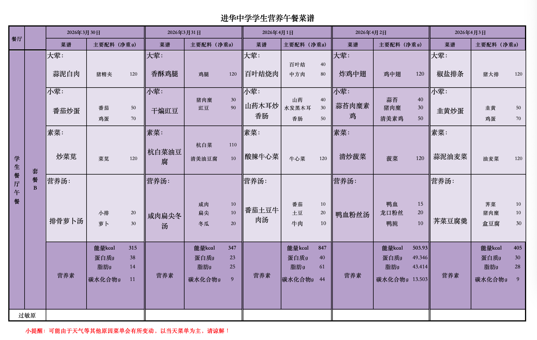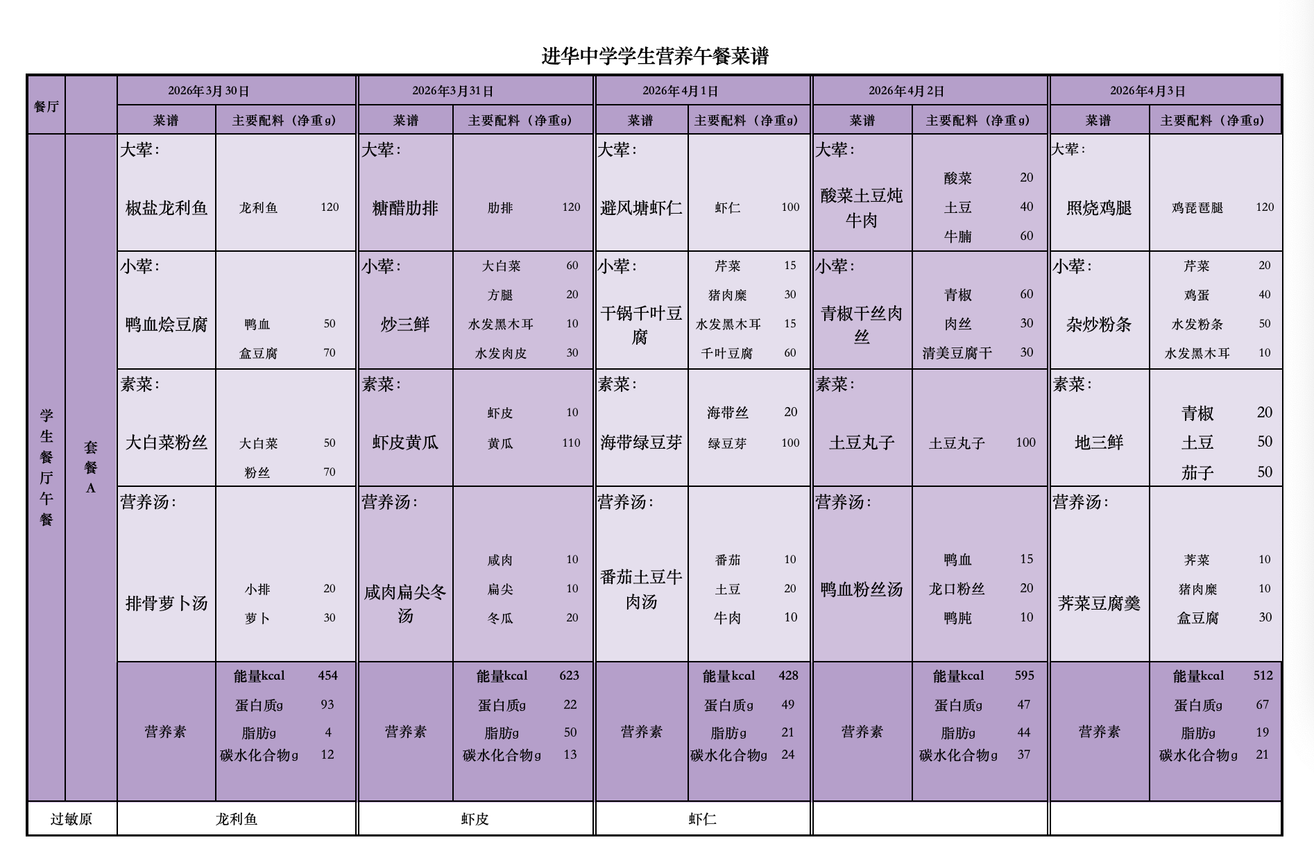 2026年3月30日—4月3日学生菜单
