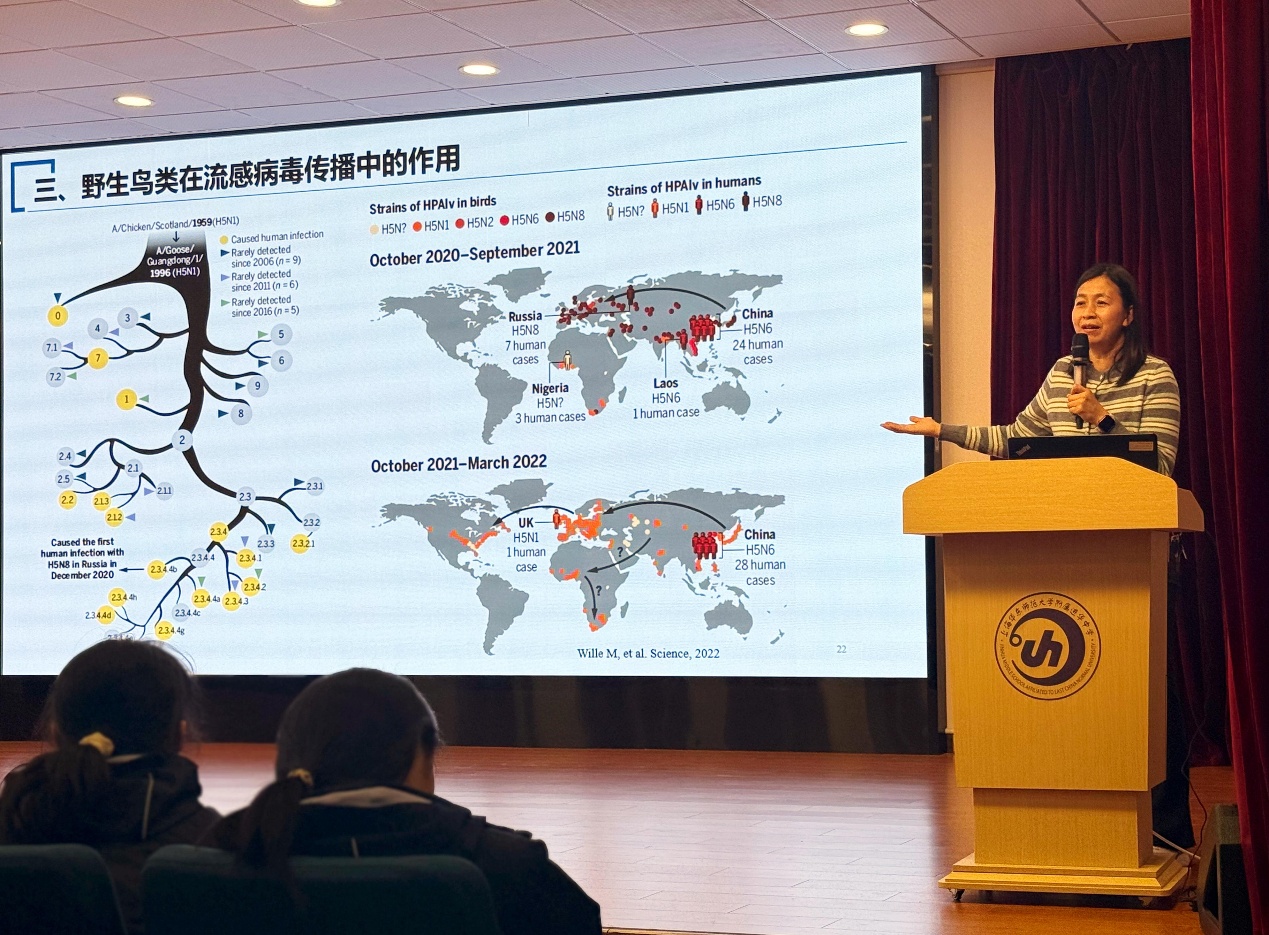 讲座的最后一部分,何教授将视野投向更广阔的自然界,重点讲解了野生鸟类在流感病毒传播中的作用。通过翔实的案例和数据,同学们了解到病毒的传播不仅仅是医学问题,更是人与动物、与环境相互作用的复杂系统。这一视角的拓展,让同学们意识到,科学从来不是孤立存在的,它需要我们以更宏阔的视野去理解世界。