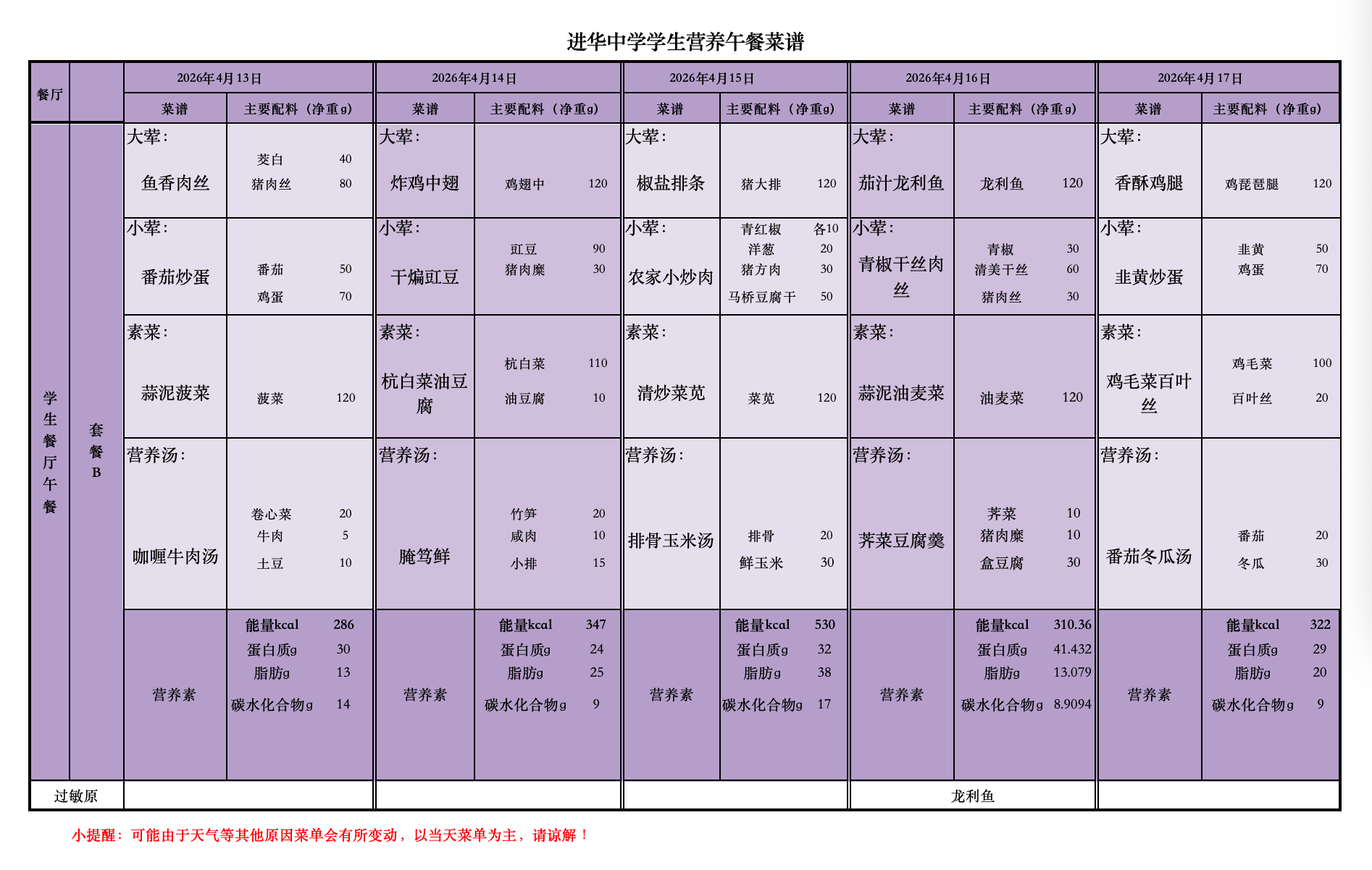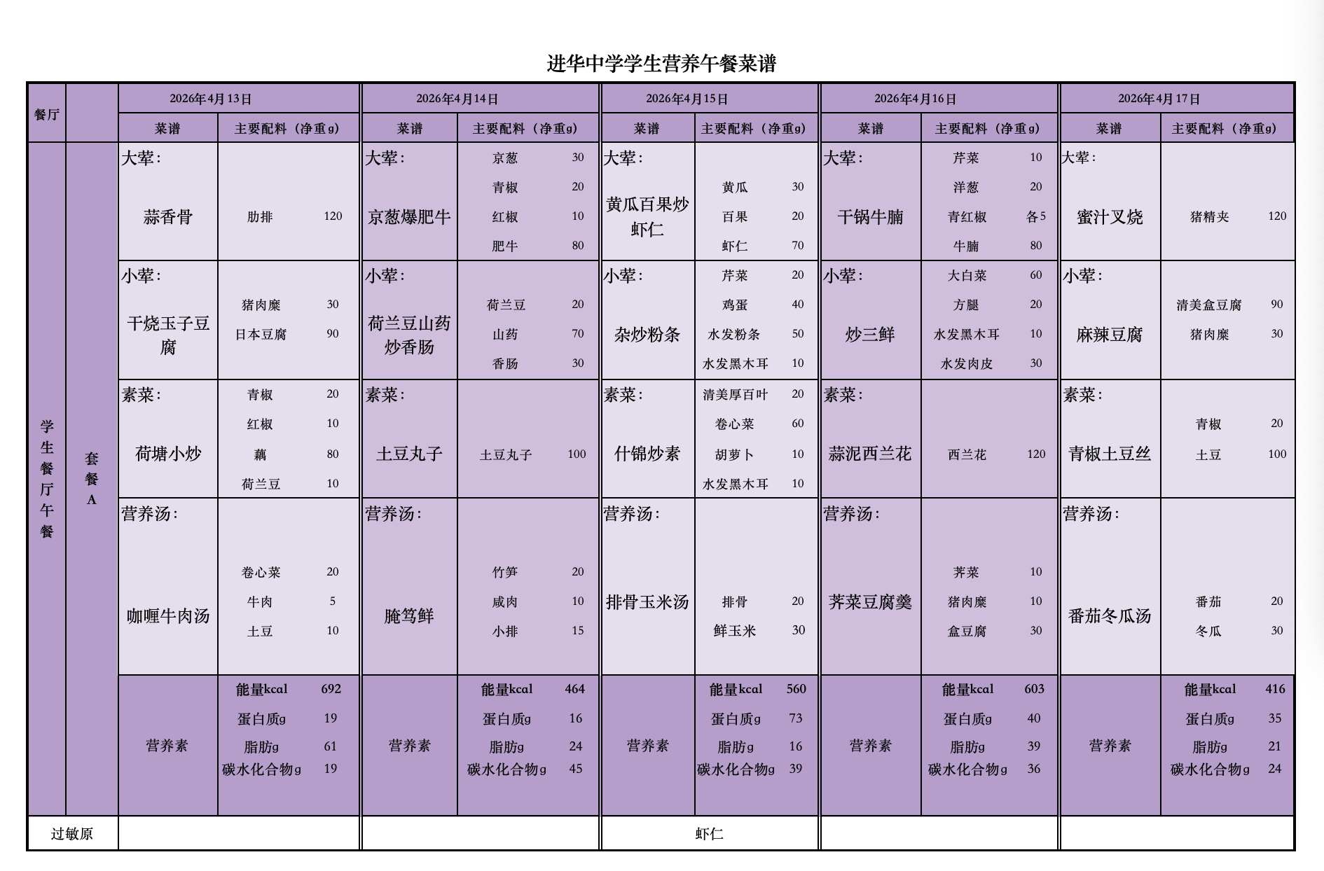 2026年4月13日—4月17日学生菜单